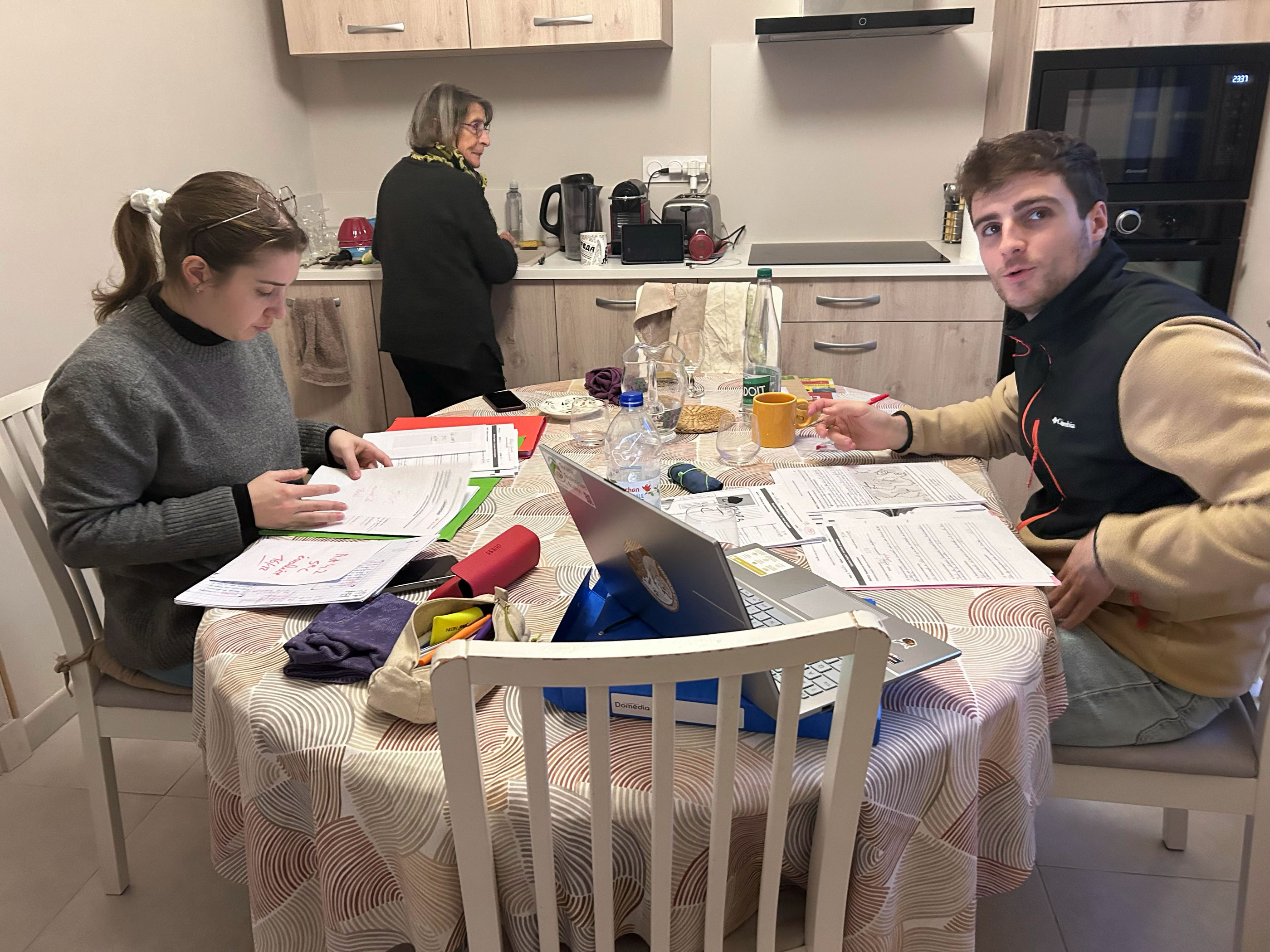 J’y ai retrouvé Clémence et Victor installés dans la cuisine, ayant trouvé qu’il y faisait plus chaud qu’en haut… Victor corrigeait des copies, et Clémence lui rentrait ses notes sur son ordi!