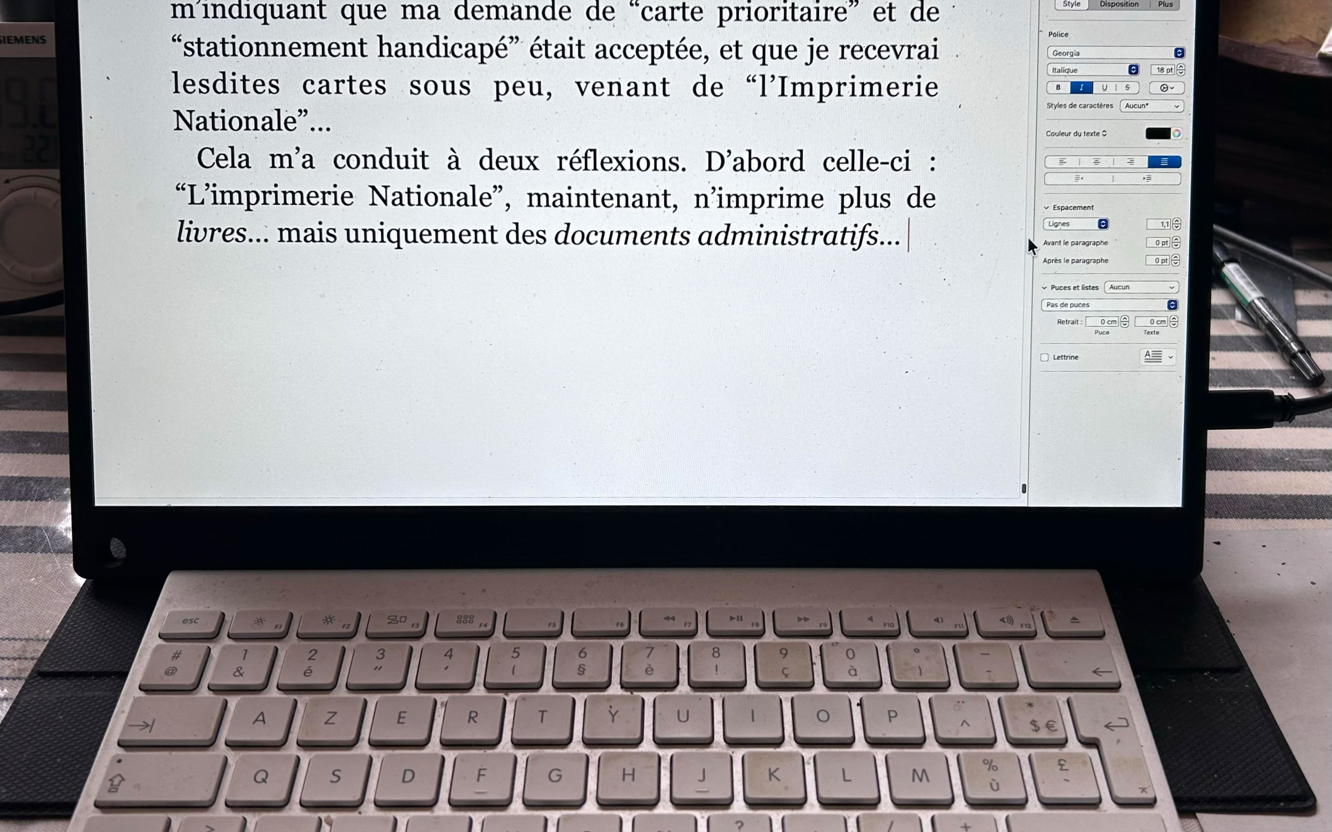 Alors il m’est venue l’idée d’utiliser autrement mon écran “plat”, qui fait tout de même 16 pouces, non plus en écran secondaire, mais “principal” et unique: j’ai refermé le “MacBookAir” après avoir sélectionné ce mode, et disposé le 16 pouces devant moi, en utilisant mon clavier “blueTooth”; et en grossissant beaucoup l’affichage de “Pages”, voilà ce que ça donne, en “plein écran”:
