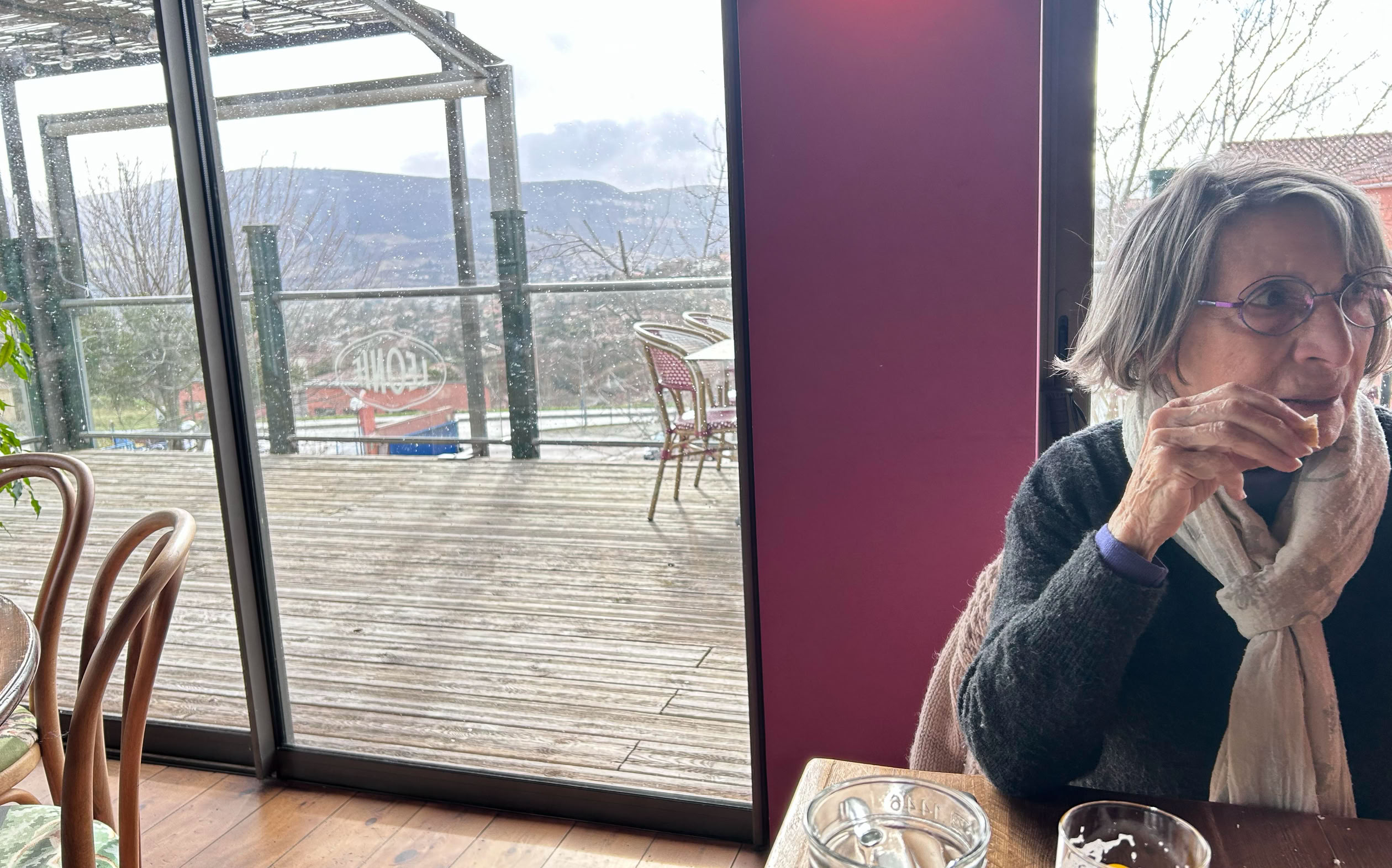 Aujourd’hui, le “Zeste” était fermé… jusqu’au 14. Comme nous avions pris la voiture,, et que “Capion” était fermé lui aussi, nous sommes montés jusqu’à “Chez Léonie”. Deux entrecôtes d’Aubrac, et deux bière “locales”… Les entrecôtes étant de taille “XXL”, avec leurs quelques légumes d’accompagnement, elles ont suffi à nous rassasier! ce qui est bien, “Chez Léonie”, c’est la vue que l’on a sur le Causse et Millau.