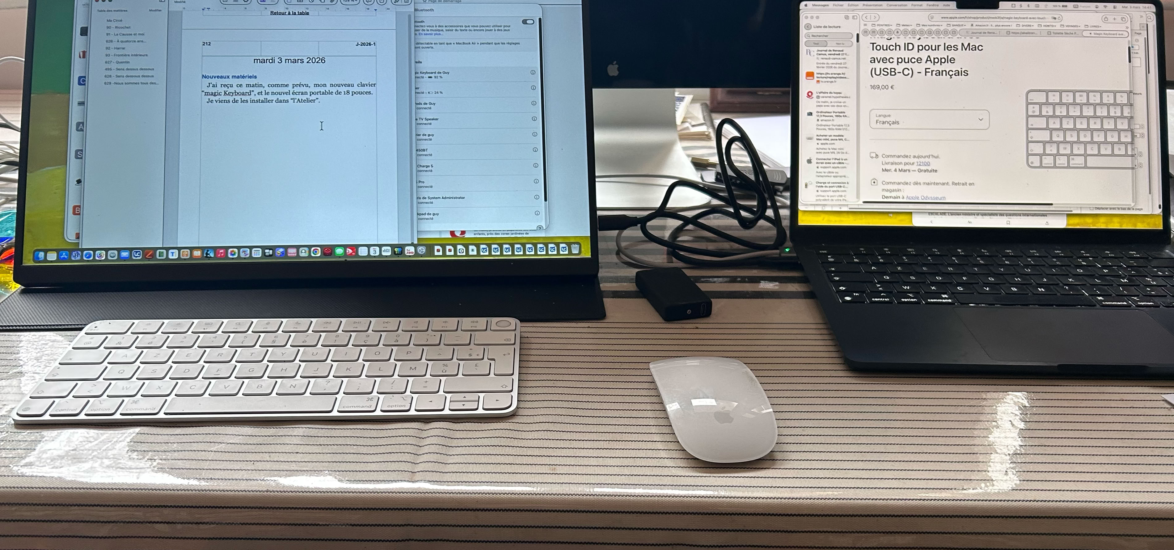 Le “Magic Keyboard” est de la même taille que le précédent, mais il est plus fin, n’a pas besoin de piles, et comporte la touche spéciale qui est sensible à mon empreinte, ce que j’apprécie beaucoup.